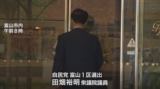 3日朝、富山市内のホテルに姿を見せた自民党、富山1区選出の田畑裕明衆議院議員。自民党富山市連の幹部による非公開の会合に出席しました。