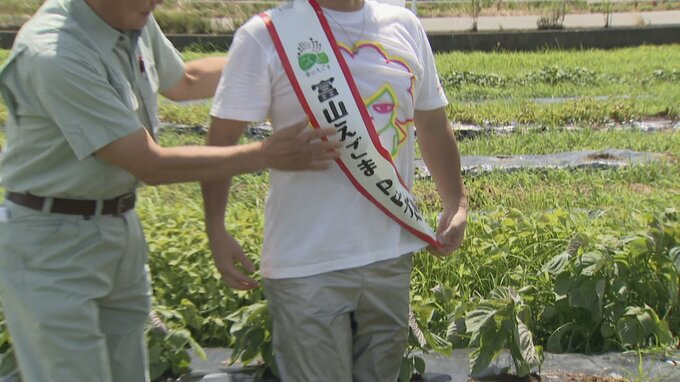 エゴマの普及に貢献したとして「富山えごまPR大使」に昇格!藤井市長からPR大使のたすきや名刺が手渡されました。