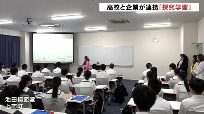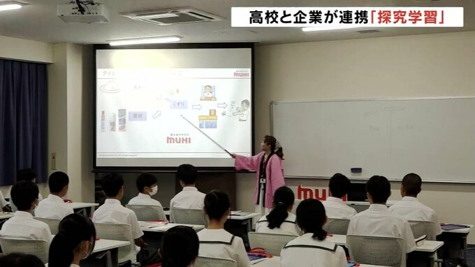 これは、おととしから高校で学習指導要領に盛り込まれている「総合的な探究の時間」の授業の一環として行われたもので今回、虫刺されの治療薬などを製造する池田模範堂と医薬品のパッケージ印刷を手がけるタイヨーパッケージが探求学習の場を提供しようと企画したものです。