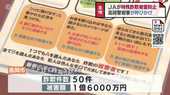 高岡市ではことしに入ってから5月末までに特殊詐欺が50件発生していて、被害額は1億6000万円を超え、わずか5か月で去年1年間の件数に迫る勢いで増加しています。