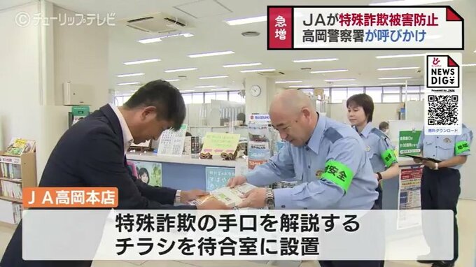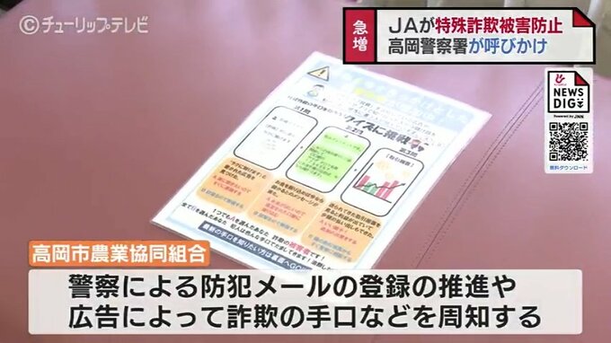 この取り組みは、高岡警察署が県内独自で交付した「特殊詐欺等被害防止対策のための依頼書」に基づいたもので、警察が詐欺の情報などを発信する防犯メールの登録の推進や、広告によって詐欺の手口などを周知することなどが盛り込まれています。