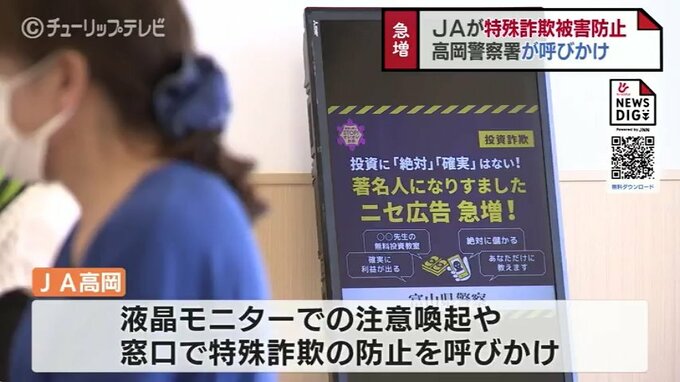JA高岡では、他にも液晶モニターでの注意喚起や窓口で特殊詐欺の防止を呼びかけます。