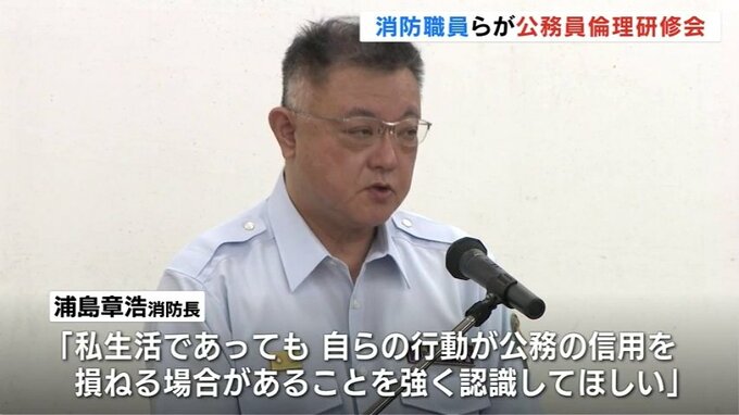 はじめに浦島章浩消防長が「私生活であっても自らの行動が公務の信用を損ねる場合があることを強く認識してほしい」と訓示。