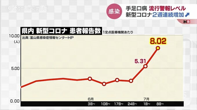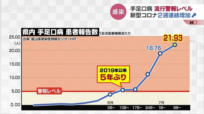 夏場に乳幼児がかかりやすいとされる『手足口病』が富山県内では、5週連続で流行の流行警報レベルを超えました。また、新型コロナウイルスも感染が拡大しています。