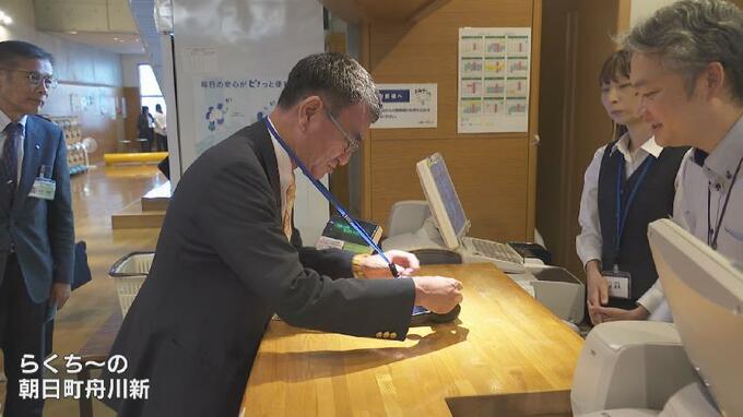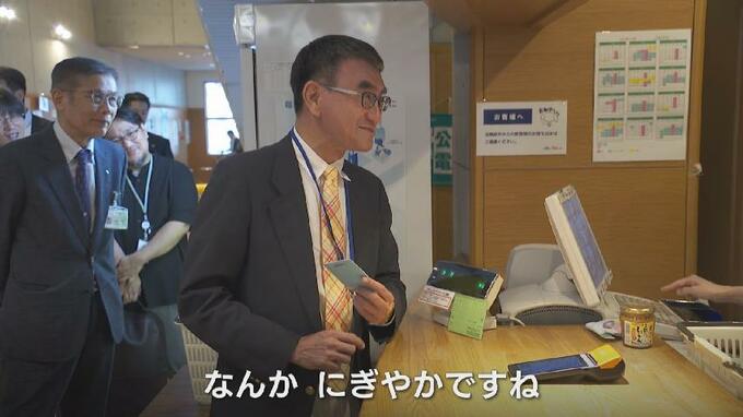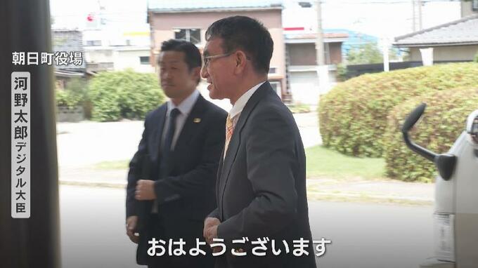 朝日町役場を訪れたのは河野太郎デジタル大臣です。視察したのは朝日町がことし1月からはじめた新しい公共サービスパス「LoCoPi(ロコピ)あさひまち」で、マイナンバーカードによる決済やポイントの獲得などが可能となる仕組みです。
