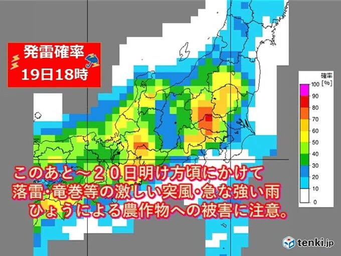 19日の北陸地方は朝から気温が上がり、富山では午後0時17分に気温が37.6℃となり、猛暑日となっています。このあとの北陸地方は、20日明け方頃にかけて、落雷や竜巻などの激しい突風、降ひょう、急な強い雨に十分注意してください。