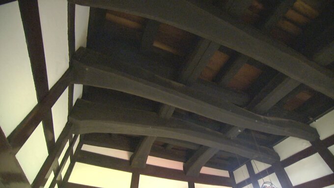 見どころは天井が高く開放感のある母屋18畳の大広間。くぎなどを使わず材木を組み合わせる「ワクノウチ」造りが特徴で雪の重みにも耐えられる富山県の伝統的民家の構造となっています。