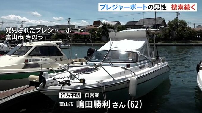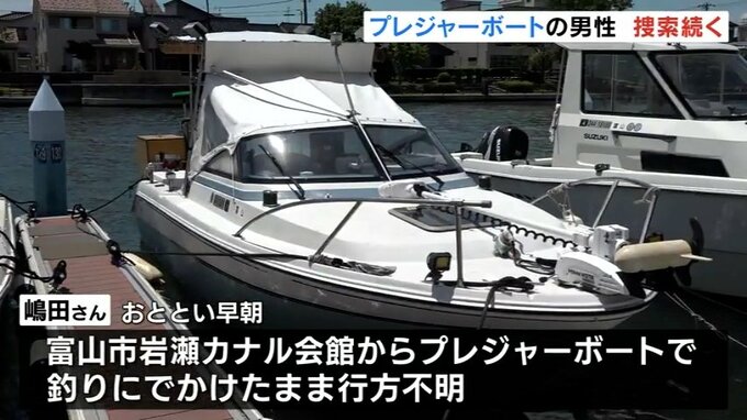 嶋田さんは20日早朝、富山市岩瀬カナル会館からプレジャーボートで釣りに出かけたまま行方不明となっていて、21日、朝日町の沖合いで漂流しているプレジャーボートが発見されましたが、嶋田さんの姿はありませんでした。