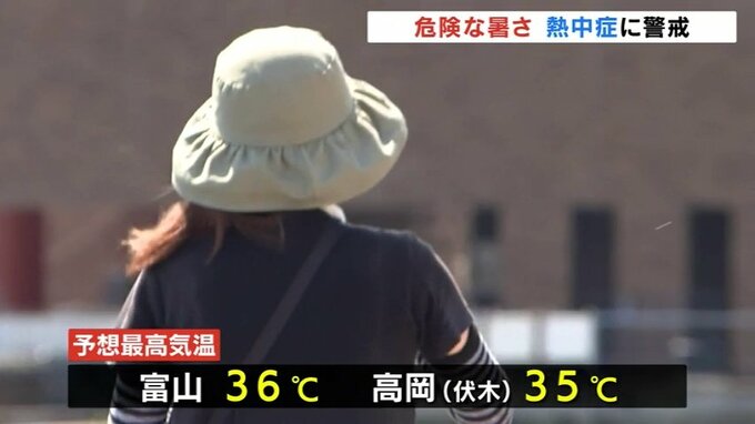 このあと気温はさらに上昇し、日中の最高気温は富山で36℃、高岡市の伏木で35℃ときのうに続いて猛暑日となる予想です。