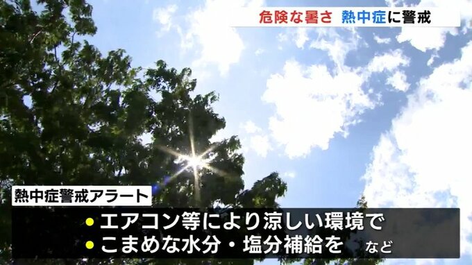 環境省などは県内に熱中症警戒アラートを出し、エアコンの使用やこまめな水分補給など熱中症に厳重な警戒を呼び掛けています。