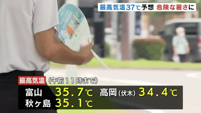 このあとも気温は上がり、日中の最高気温は、富山、高岡市の伏木ともに37℃の予想です。