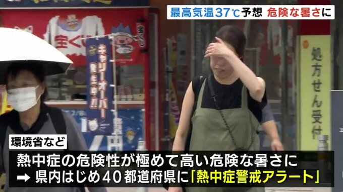 熱中症の危険性が極めて高くなる危険な暑さが予想されるとして、環境省などは、県内をはじめ今年最多となる40都道府県に「熱中症警戒アラート」を発表。