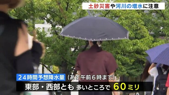 26日午前6時までに予想される24時間降水量は多いところで、東部・西部ともに60ミリとなっています。夜遅くにかけては、土砂災害や低い土地の浸水、河川の増水に注意・警戒してください。