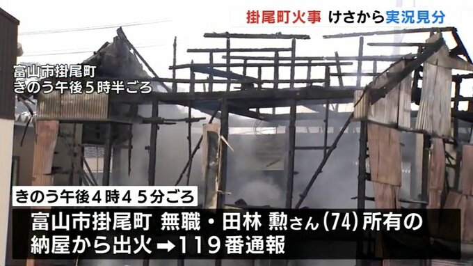 24日午後4時45分ごろ富山市掛尾町の無職・田林勲さん(74)さんの敷地内にある納屋から爆発音がし、炎が出ているのを田林さんが見つけ、119番通報しました。