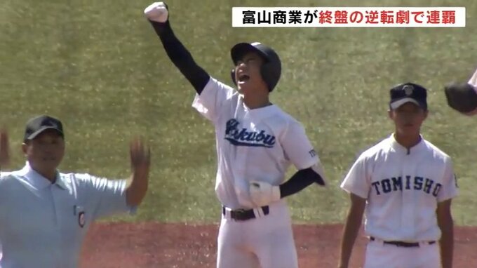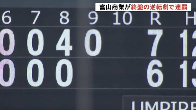 追いかける富山商業は8回。6番・森がセンター前にタイムリーヒット。さらに、8番・途中出場の1年生、堂口がレフト前にタイムリーヒットを放ち、この回、一挙4得点の猛攻で、7対6と逆転に成功します。