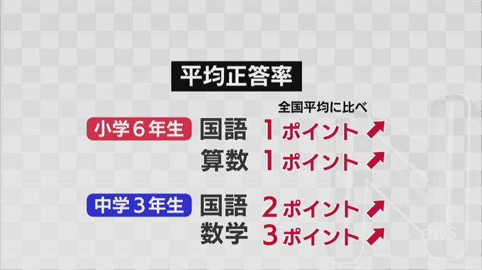 教科別の平均正答率をみると県内は小学校の国語と算数で全国平均を1ポイント上回り、中学校国語では全国平均を2ポイント、数学では3ポイント上回りました。
