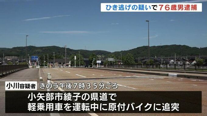 富山県警小矢部警察署によりますと、小川容疑者は1日午後7時35分ごろ、小矢部市内の県道で軽乗用車を運転中、前を走っていた原付バイクに追突しました。