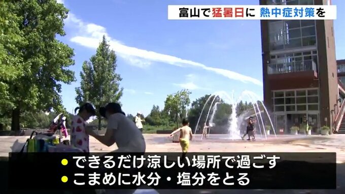 厳しい暑さの中少しでも涼を感じようと、富山市の富岩運河環水公園にある噴水広場では子どもたちが水遊びをする姿も。
