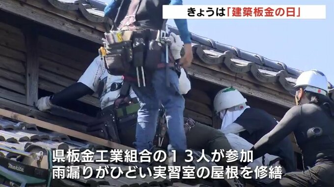 3日は、県板金工業組合の13人が高岡工芸高校に集まり、雨漏りがひどかった実習室の屋根を修繕しました。