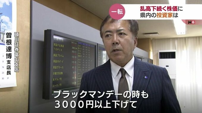頭川証券富山支店 曽根達博 支店長:「ブラックマンデーの時も3000円以上下げて翌日にすぐ2000円以上上げておりましたので、そういうこともあるのかなと思っておりました。値段が心配な方とか今日朝から値段が高かったので(買うか)迷っておられるお客さんが多かった」
