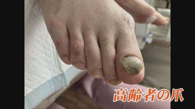 フットケアの専門店「ドクターネイル爪革命」が実施した調査によりますと、介護施設に働く人のうち9割がこうした高齢者の足の爪のトラブルを確認したことがあるということです。