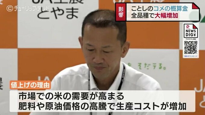 JA全農とやまは値上げの理由として、米以外の食料品の価格上昇により市場での米の需要が高まっていることや、肥料や原油価格の高騰で、生産コストが増加していることを挙げました。