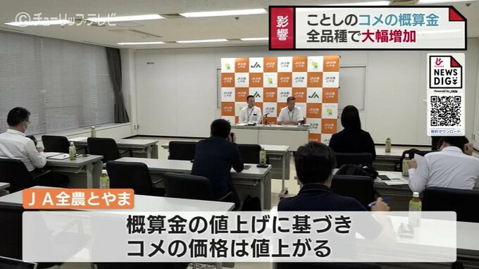 全国では、ことし6月末時点でコメの民間在庫量が156万トンと統計開始以来過去最少となっていて、JA全農とやまは概算金の値上げに基づきコメの価格は値上がるとみています。