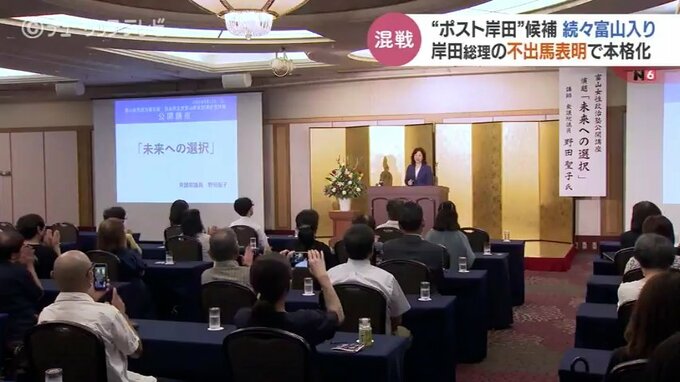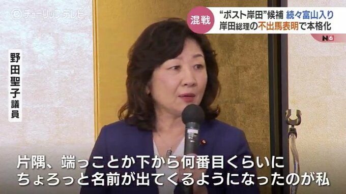 野田聖子議員:「最近ぼちぼちと新聞の自民党総裁選挙一覧表みたいななかの片隅、端っことか下から何番目くらいにちょろっと名前が出てくるようになったのが私、野田聖子でございます」