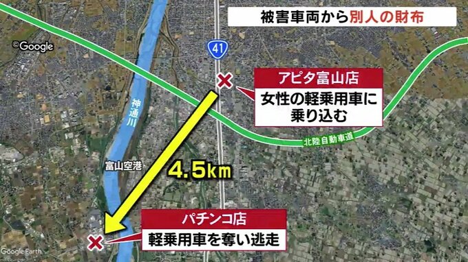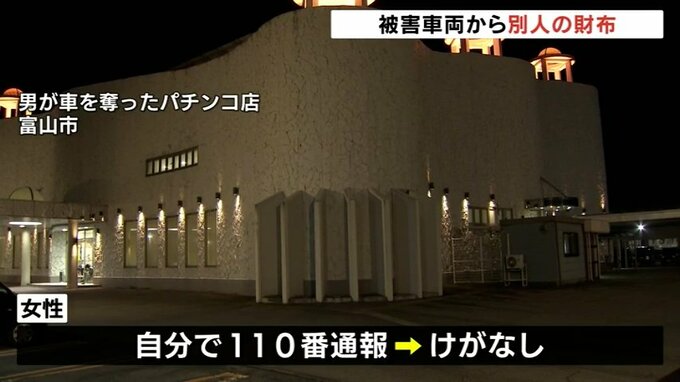 20日富山市で、男が女性を脅して軽乗用車を奪い現在も逃走している事件で乗り捨てられた車両のなかから被害者の物ではない財布が見つかったことが捜査関係者への取材でわかりました。
