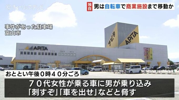 今月20日午後0時40分ごろ、富山県富山市のアピタ富山店の1階駐車場で、70代の女性が乗っていた軽乗用車の運転席側の後部座席に男が乗り込んできて「刺すぞ」「車を出せ」などと脅しました。