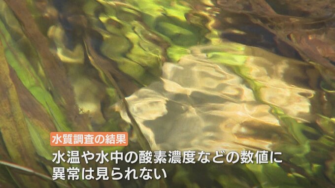 富山市の職員らが死がいが見つかった場所とその上流の水質調査を行いましたが、水温や水中の酸素濃度などの数値に異常は見られず、原因の特定には至りませんでした。