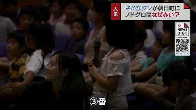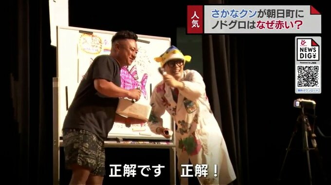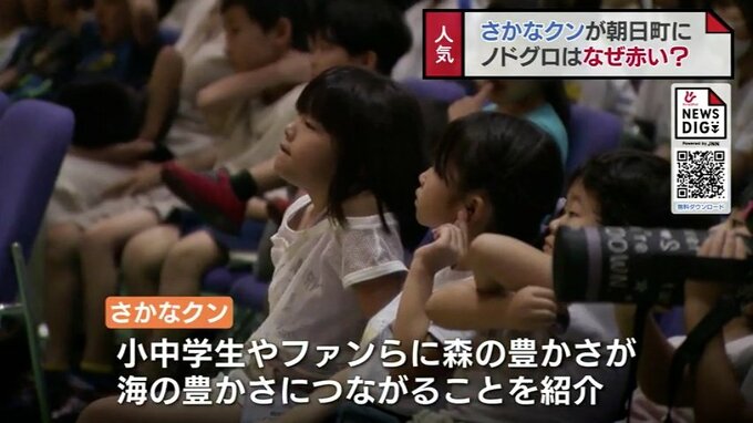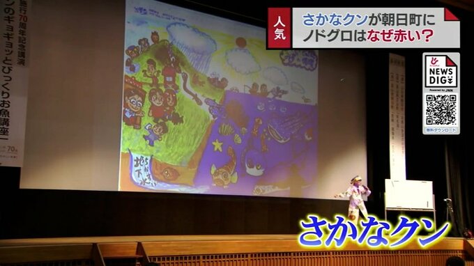 富山県朝日町に「さかなクン」が登場し、大勢の子どもたちを前にクイズを交えて魚の魅力を語りました。