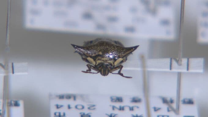 アロハシャツのようなトロピカルな模様をしているのが「アカギカメムシ」。本州に生息するカメムシの中でも最も大きいといわれていて、暖かい地域を好む種です。これまで富山県では見つかっていませんでしたが、2020年に氷見市で2匹。2023年に富山市で1匹を確認。近年の温暖化などが影響しているとみています。