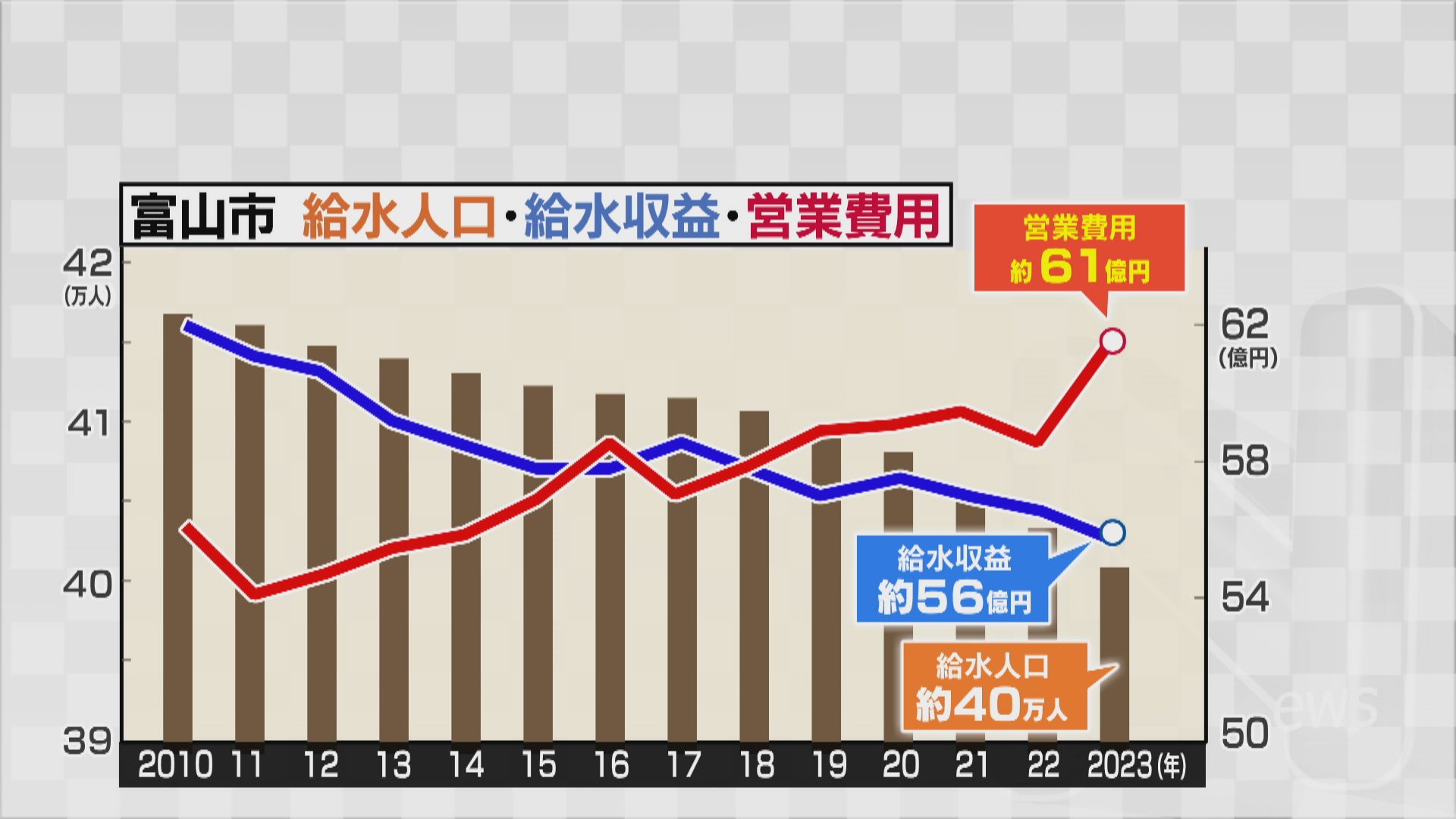 この間、人口減少などで水道料金による収益は減少し、2010年に最高およそ62億円あった収益は昨年度はおよそ56億円と過去最低になりました。