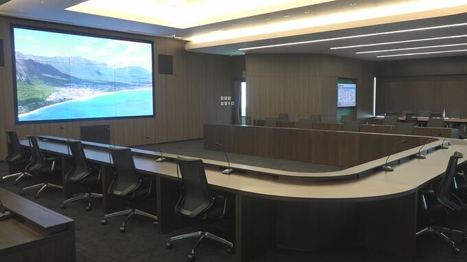 新社屋の5階には180インチの巨大画面が設置された会議室。勤務時間外には「シアタールーム」として使うことができ、映画鑑賞をすることができます。