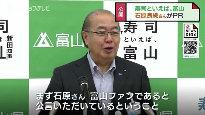 新田知事:「まず石原さん、富山ファンであると公言されていると、これがまず俳優さんあるいはタレントさんから選ぶ中でそこが石原さんにお願いする一番の理由であります」「明るくコミカルに一面を大きく生かした演技を期待した」