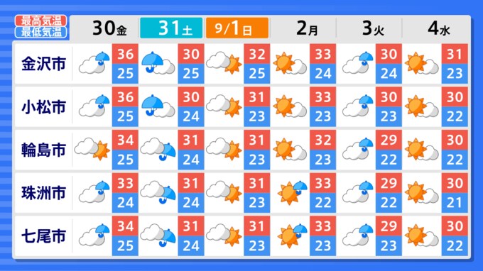 気象庁によりますと、前線が日本海から北日本を通り千島近海にのびており、前線に向かって暖かく湿った空気が流れ込んでいます。このため、北陸地方では28日夜のはじめ頃にかけて大気の状態が非常に不安定となり、雷を伴って激しい雨が降り、大雨となる所があるでしょう。