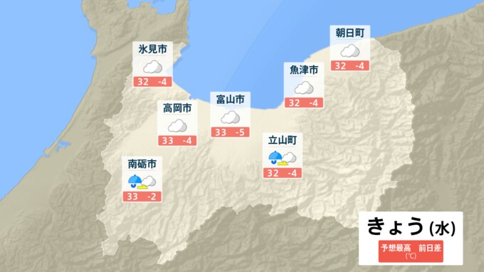 気象庁によりますと、前線が日本海から北日本を通り千島近海にのびており、前線に向かって暖かく湿った空気が流れ込んでいます。このため、富山県では28日夜のはじめ頃にかけて大気の状態が非常に不安定となり、局地的に雷を伴って激しい雨の降る所があるでしょう。