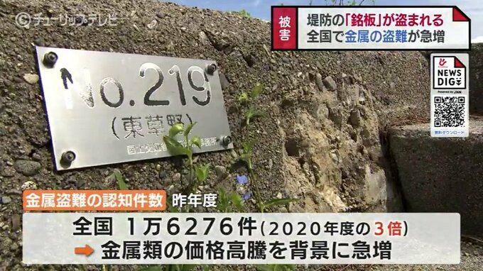 警察庁によりますと金属盗難の認知件数は昨年度、全国でおよそ1万6000件と2020年の3倍となり金属類の価格高騰を背景に被害が急増しています。