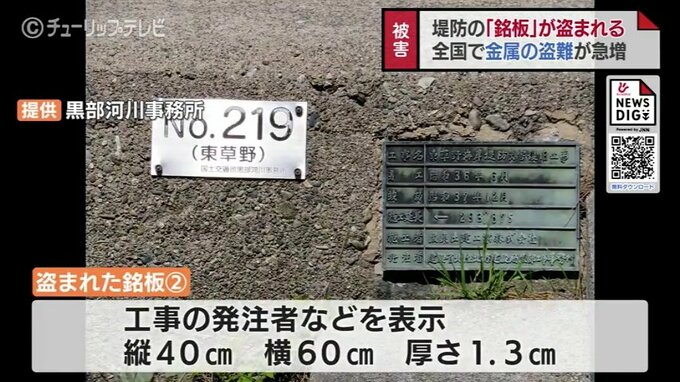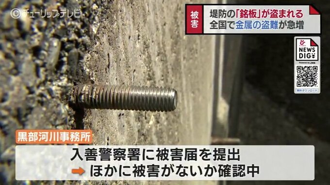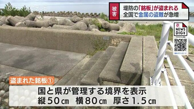 盗まれたのは朝日町東草野の海岸堤防に設置されていた「銘板」と呼ばれる金属の板2枚です。