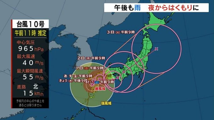 一方、強い台風10号は午前8時ごろに鹿児島県に上陸。時速15キロで北に進んでいます。中心の気圧は965ヘクトパスカルで、中心から半径110キロ以内は風速25メートル以上の暴風域となっています(29日午前10時時点)。