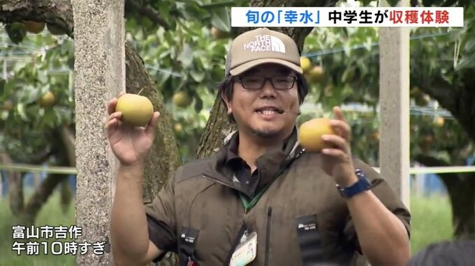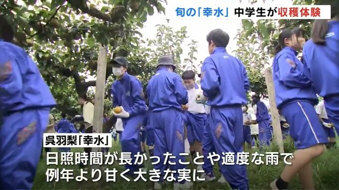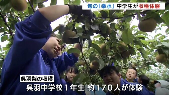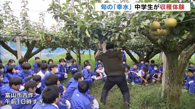 29日は呉羽中学校の1年生およそ170人が富山市吉作地区・土池伸弥さんの梨園を訪れ呉羽梨「幸水」の収穫を体験。