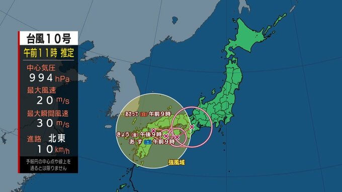 気象庁によりますと台風10号は、30日10時には国東市付近にあって、1時間におよそ10キロの速さで北東へ進んでいます。中心の気圧は994ヘクトパスカル、最大風速は20メートル、最大瞬間風速は30メートルで中心から半径390キロ以内では風速15メートル以上の強い風が吹いています。