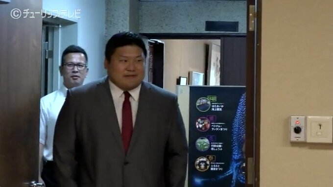 スーツ姿で現れた滑川高校出身、タンク村上こと、村上英士朗選手。