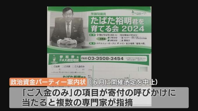 田畑議員を巡っては、6月に開催予定だった政治資金パーティーの案内状にある「ご入金のみ」の項目が寄付の呼びかけに当たると複数の専門家が指摘。国会で野党が違法なパーティーだとして岸田総理を追及し、富山市連は7月、田畑議員を厳重注意としました。