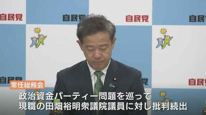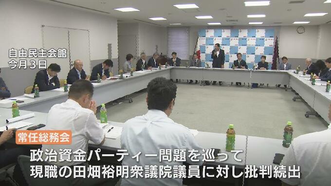 9月3日の常任総務会では、政治資金パーティー問題を巡って現職の田畑裕明衆議院議員に対し出席議員から批判が続出。続投についての意向調査で「賛成」が半数強、「反対」または「決めかねる」が半数弱と賛否が分かれ、候補者として認めるかどうかを問うアンケートを行うことを決めました。対象は富山1区の党員およそ6000人です。
