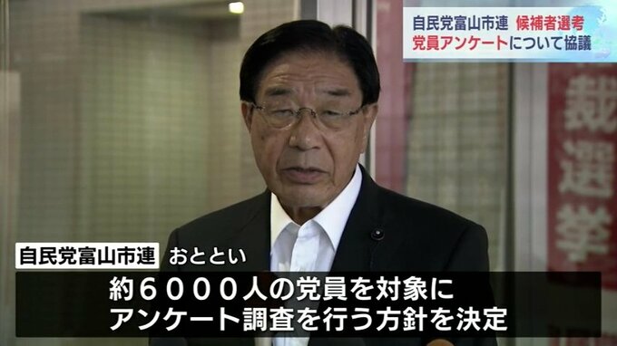 次期衆院選富山1区の候補者選考を巡って自民王国富山が混乱しています。7日、自民党富山市連は常任総務会を開き、次の衆院選富山1区の候補者選考で実施する党員アンケートについて話し合いました。