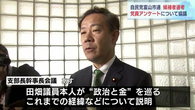 7日に決まった内容は富山市連の各支部の支部長・幹事長が集まる8日の会議で示されます。またこの会議で田畑議員本人が「政治と金」を巡るこれまでの経緯などについて説明するということです。