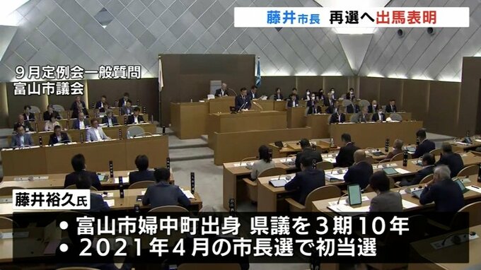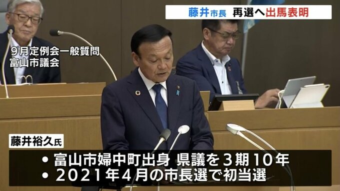 富山市の藤井裕久市長は9日の市議会9月定例会本会議で、2025年春に行われる市長選に再選を目指し出馬することを表明しました。