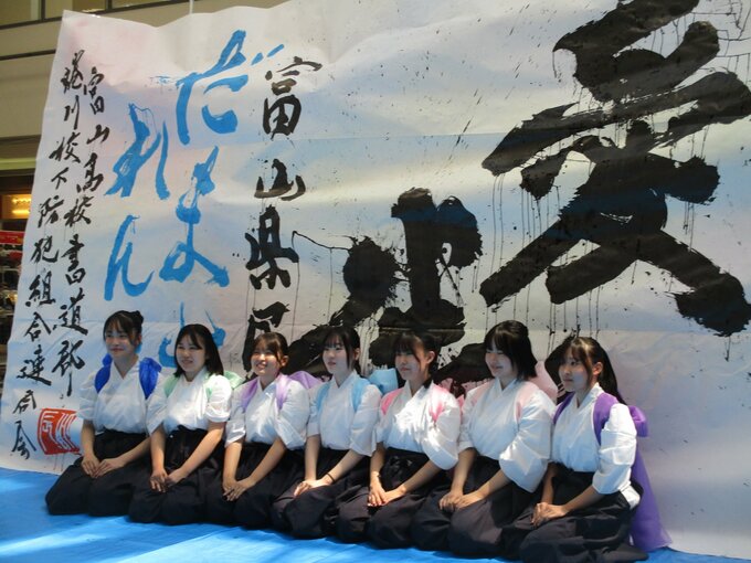 生徒たちは縦3メートル横6メートルの紙に「富山県民はだまされんちゃ」などと音楽に合わせて筆を走らせ、真剣な表情で取り組んでいました。